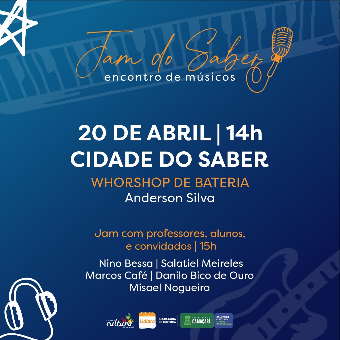 O evento será iniciado com o Workshop de Bateria, ministrado por Anderson Silva, renomado baterista da cena musical baiana. Em seguida, acontece a Jam com professores e alunos da instituição, artistas convidados, estando aberto ainda para os músicos que desejarem participar.